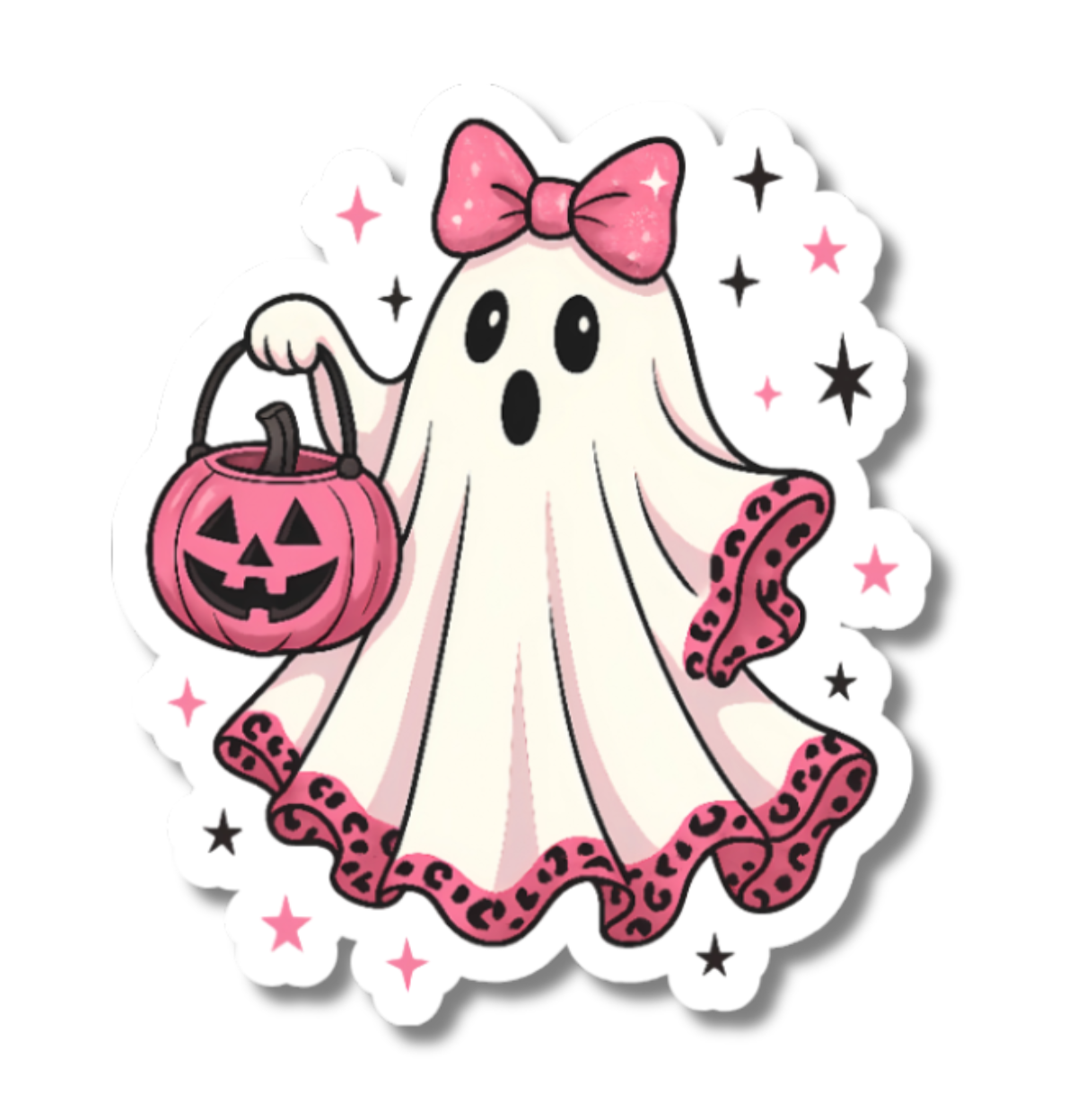 This adorable ghost is here to bring a little glam to spooky season. With her sweet style and festive charm, she’s perfect for decorating water bottles, laptops, journals, or Halloween party favors. Durable and weatherproof, she’s ready to haunt your gear long after October ends.