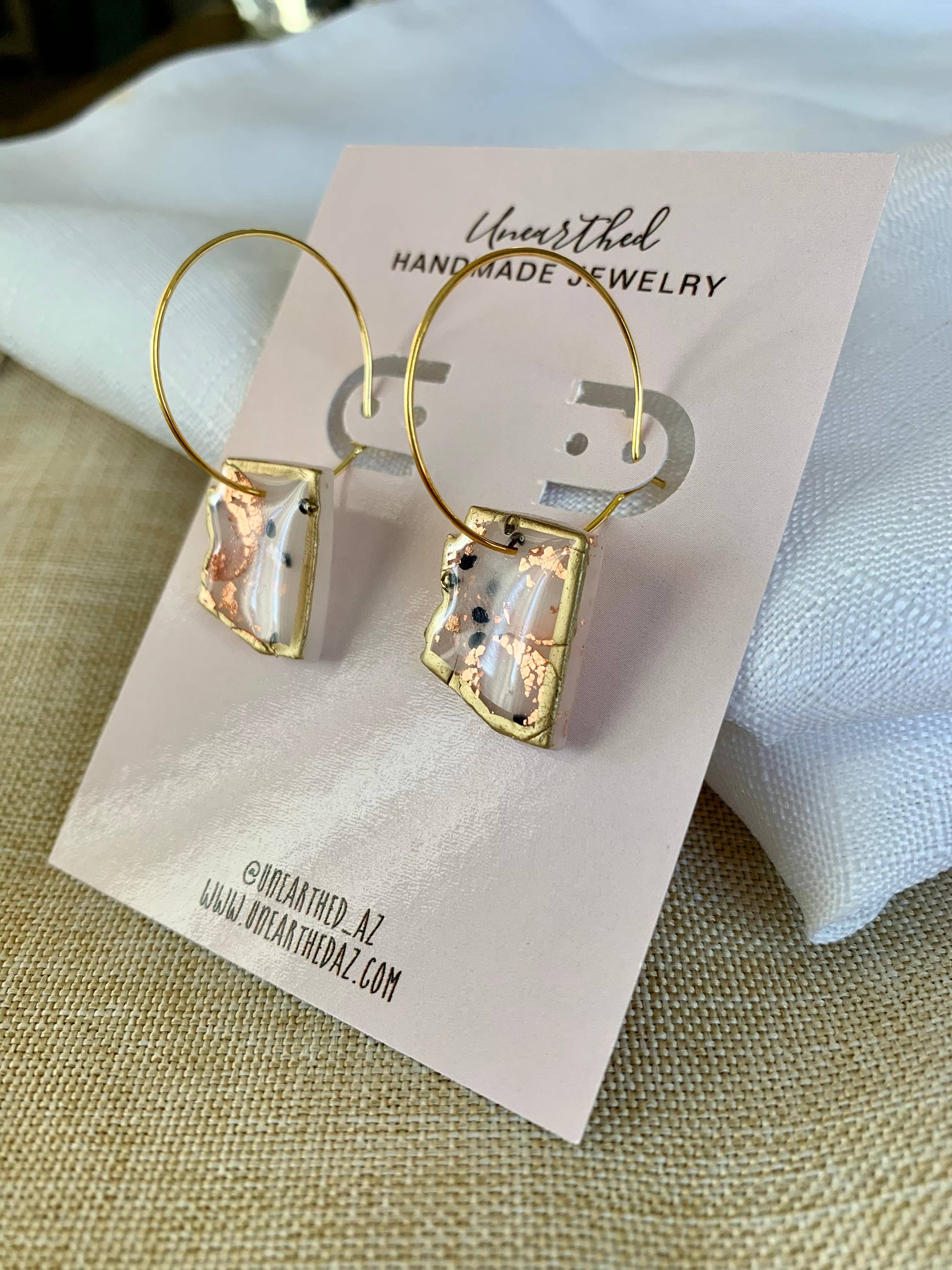 Saguaro Seeds | Mini AZ Hoop Earrings Translucent mini Arizonas with a gold painted trim with copper leaf and real saguaro seeds! Topped with resin for a glossy finish! This set is incredibly unique and special and truly one of a kind