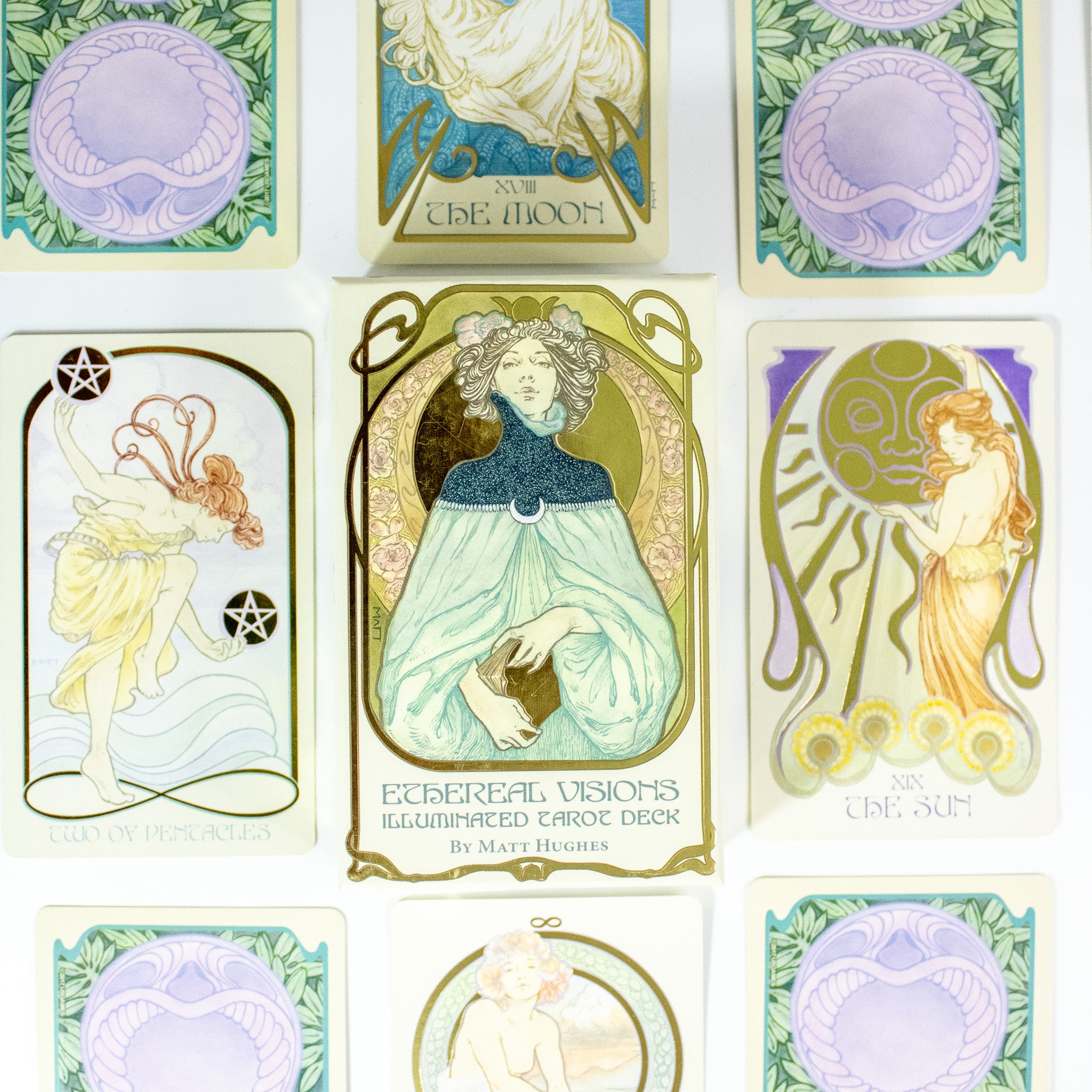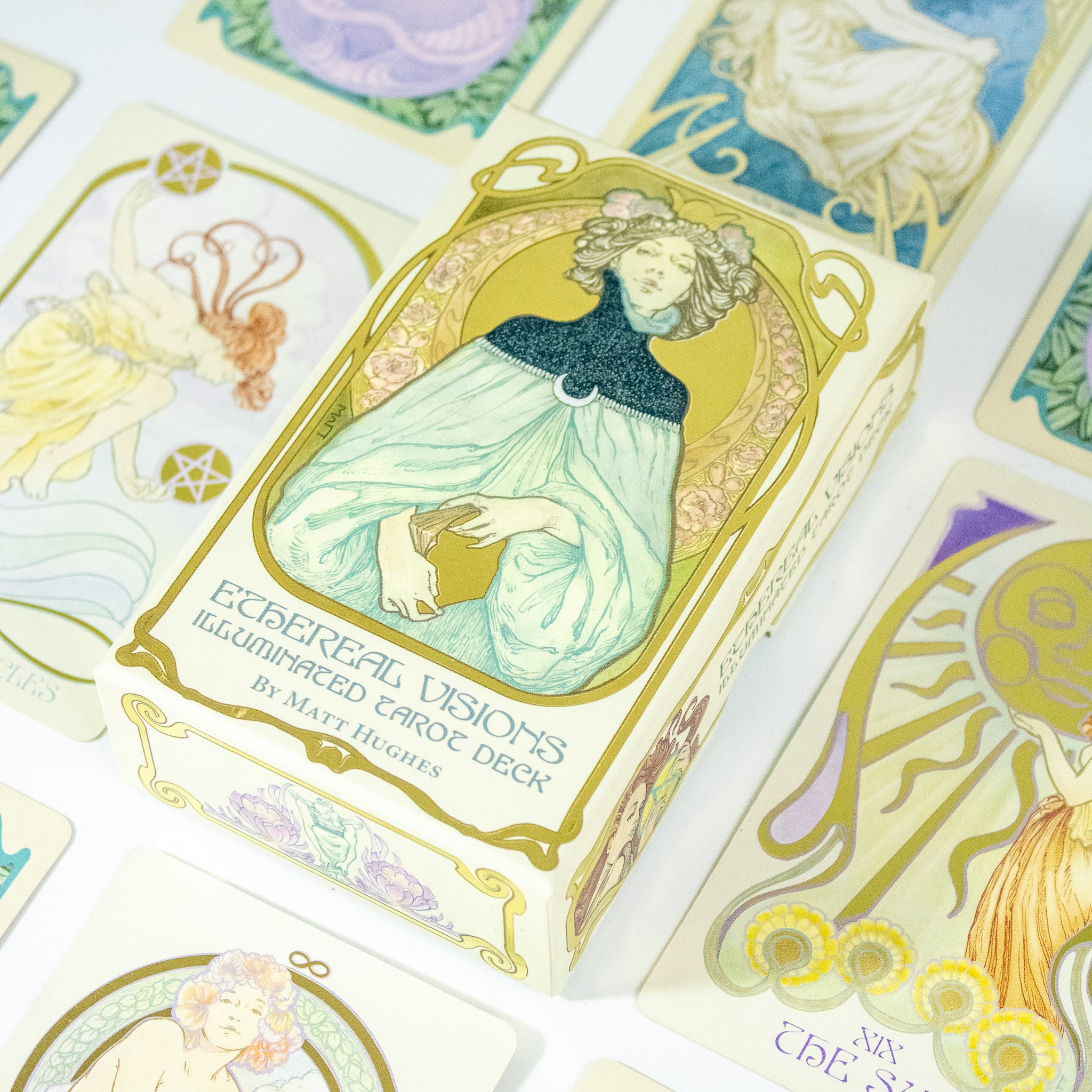 Step into a luminous realm where the elegance of Art Nouveau meets the mystique of tarot. The Ethereal Visions Illuminated Tarot Deck is an 80-card collection that reimagines the traditional Rider-Waite-Smith system through the intricate artistry of Matt Hughes. Each card is hand-drawn and colored, then adorned with gold foil stamping, creating a deck that is both visually stunning and spiritually resonant.